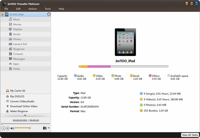 ImTOO iTransfer Platinum provides the all-around iPad/iPhone/iPod solutions which can backup all kinds of multimedia files, including music, movies, photos, eBooks in iPad/iPhone/iPod to computer or iTunes, convert DVD, ISO images, IFO folders, CD, audios, and videos to iPad/iPhone/iPod movies and music, one-step to download and convert online videos to iPad/iPhone/iPod compatible video/audio files, produce iPhone ringtones from audios or videos etc.