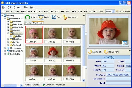 Total Image Converter helps you to convert image sizes and formats. A must-have utility for all web designers. ImageConverter is unique - it supports almost all popular formats (JPG, GIF, BMP, PBM, PGM, PCX, PNG, PPM, TGA, TIF, WMF, EMF). All you have to do is to set the required size or format and Total Image Converter automatically does the rest.