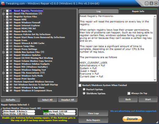 Tweaking.com – Windows Repair is an all-in-one repair tool to help fix a large majority of known Windows problems including registry errors and file permissions as well as issues with Internet Explorer, Windows Update, Windows Firewall and more. Malware and installed programs can modify your default settings. Using Tweaking.com – Windows Repair you will have the possibility to restore your OS to its original settings.